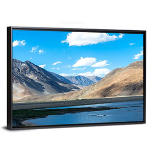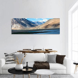 Mountain in Ladakh, India presents a panoramic view of mountains, a lake and a cloudy sky. The photorealistic print captures sunlight casting shadows across blue, brown, white and gray tones for a serene, majestic, and vast atmosphere. It suits modern and nature-themed interiors as a calm focal piece.