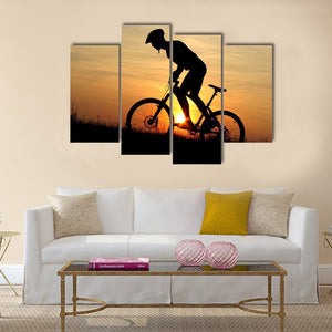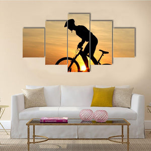 A cyclist, helmet visible, is silhouetted against a warm sunrise sky over a hillside, naming the subject and mood up front. The orange, yellow and black palette and dramatic lighting create a peaceful, adventurous and serene atmosphere. Fits modern home decor and room settings that favor landscape art.