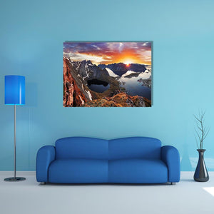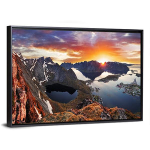 Mountain Coast Norway Canvas Art depicts snow-capped peaks, rocky terrain and a calm lake beneath an orange-and-blue sunset, with a rule-of-thirds composition that creates a dramatic atmosphere. It suits modern home décor as a bold focal point in living spaces.