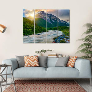 Experience the serene beauty of Fitzroy River as it flows through majestic mountains. This vibrant landscape captures the essence of nature with sunlight breaking through the peaks, creating a captivating scene that invites tranquility into your space.