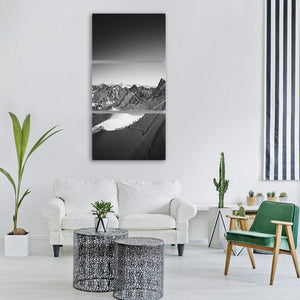 Snowy mountains and a line of tiny figures on a ridge set the scene in this monochromatic landscape, giving a sense of scale and depth. The black, white, and grey palette creates an epic, serene winter mood. Suited to modern or minimalist interiors as a striking nature-focused wall art piece.