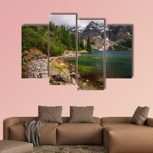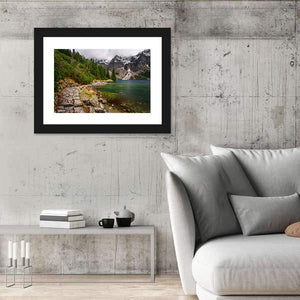 Rocky Road Along Shore Canvas Wall Art depicts a realistic mountain-lake scene with a rocky shore, stone path, clear water with visible rocks, and a stand of pine forest beneath snow-capped mountains. Rendered in cool greens, blues, grays, browns, and white and composed with the rule of thirds, it carries a serene, majestic mood. It fits modern home decor and works well in living rooms or studies where a calm nature focus is wanted.
