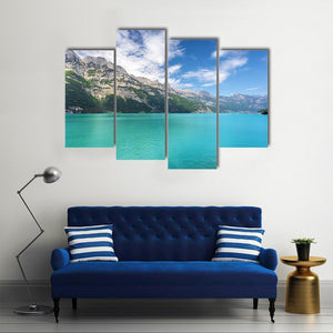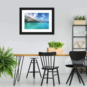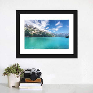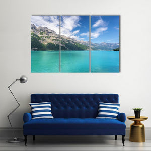 Mountain Lake In Switzerland shows a photorealistic mountain range and turquoise lake beneath fluffy white clouds, with a calm, majestic atmosphere. The cool blue-green palette and peaceful mood work well in modern living rooms or bedrooms as nature-focused wall decor.