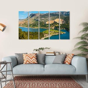This landscape artwork features serene mountains and a tranquil lake, capturing the beauty of nature. The cool blues and greens evoke a calming atmosphere, perfect for bringing a touch of the outdoors into your space.