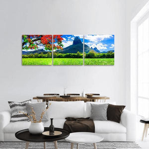 Red Tree Mauritius Panoramic Canvas shows a photorealistic landscape with a red‑flowered tree in the foreground, a bright green grassy field, and a pointed mountain beneath fluffy white clouds. The scene reads vibrant and serene, with summer daylight colors of green, blue, red, and white. It suits room decor in modern living rooms or bedrooms.