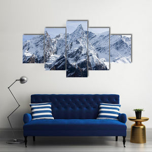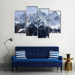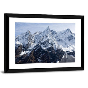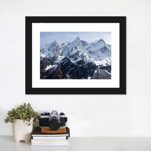 This canvas art captures the majestic beauty of snow-capped mountains and rocky peaks set against a vast sky. The photorealistic style and blend of blue, grey, and white evoke a serene yet powerful atmosphere, perfect for your living space.