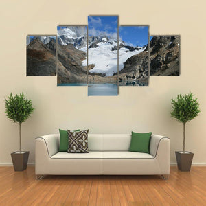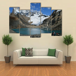 Mountain Of The Andes Canvas Wall Art depicts a wide, realistic landscape: a mountain lake with snow-capped peaks and a rocky shore where people are visible on the shore. Its cool blue, white, brown, and gray palette and serene, majestic mood fit modern home spaces like living rooms or entryways that favor calm, natural imagery.