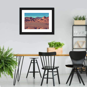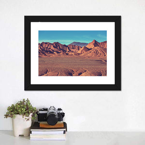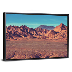 Mountain Plateau La Puna presents desert mountains and a canyon with cracked earth in the foreground and layered ridges receding into the distance. Rendered realistically in vibrant orange, brown, blue, and red tones, it strikes a dramatic yet serene mood and suits modern living spaces or a calm entryway.