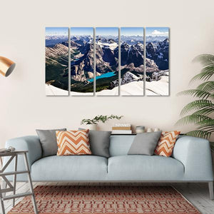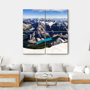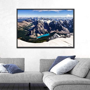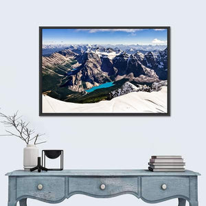 This canvas wall art captures the stunning Mt. Temple, showcasing a majestic mountain range and a vibrant turquoise alpine lake. The photorealistic depiction highlights the dramatic slopes and layered peaks, inviting serenity and a sense of vastness into your space.