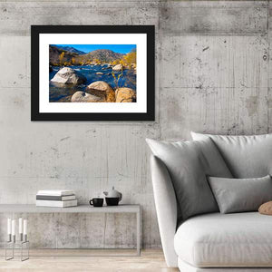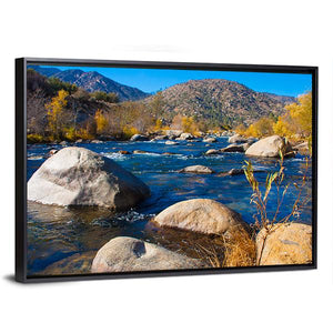 River In Sierra Nevada shows a clear river winding through rocks, autumn foliage, trees and distant mountains in a photorealistic landscape. The blue, green, brown and gray palette creates a serene, natural and vibrant mood. It suits living rooms and modern homes looking for nature-focused wall decor.