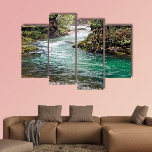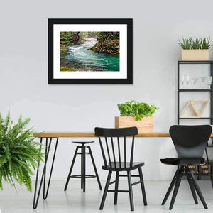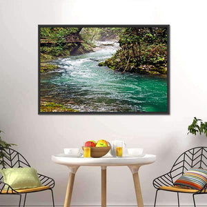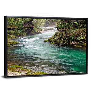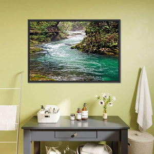 Mountain River Canvas Wall Art shows a realistic landscape of a clear turquoise river flowing through a lush forest beside a wooden walkway. The image feels serene and refreshing, using greens, blues, browns, and white with a depth-focused, rule-of-thirds composition. It suits modern homes and room decor such as living rooms or bedrooms.