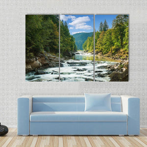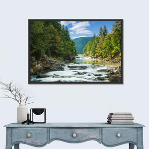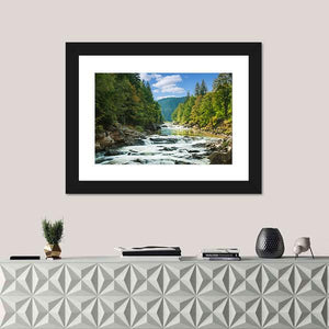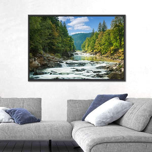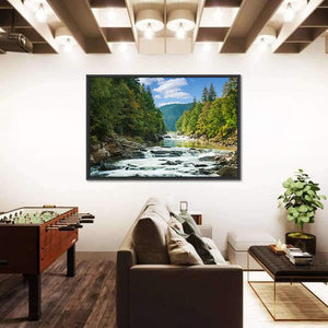 This canvas art captures a serene landscape of a river flowing through a lush forest. With realistic details and a refreshing palette of greens and blues, it brings a sense of peace to any space.