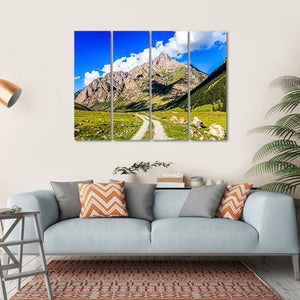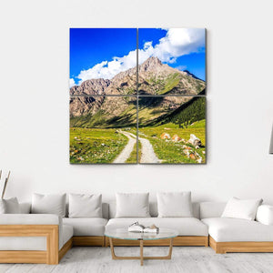 Discover the beauty of a serene mountain range with this canvas art. Featuring a dirt road meandering through a grassy valley, it's a perfect capture of nature's grandeur, with blue skies and lush pine trees. Ideal for adding a touch of adventure to your wall decor.
