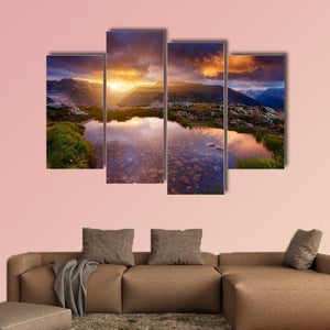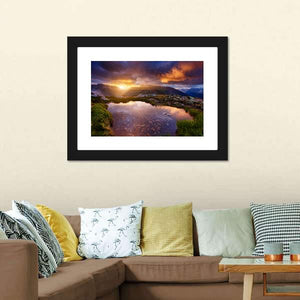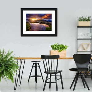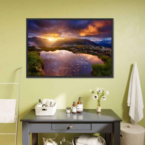 A photorealistic mountain lake at sunset with dramatic clouds and a rocky shore, captured where the sun sets behind the peaks. Orange and purple sunbeams reflect across the water, giving the scene a dramatic yet serene, majestic mood. Works well in modern homes—consider it for a living room, bedroom, or office.