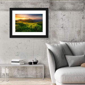 This canvas wall art captures a serene mountain valley at sunrise, showcasing majestic peaks and vibrant grass. The artwork features sunbeams radiating from behind the mountains, creating a peaceful atmosphere perfect for any nature lover.