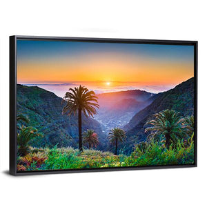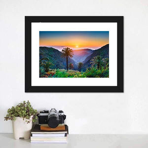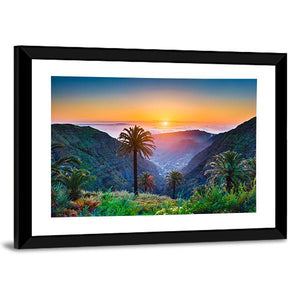 A warm, serene landscape of palm trees and a sunlit mountain valley at sunset. The sun sits partly behind clouds while hillsides are covered in green vegetation, shown in orange, blue, green and brown tones. The modern style makes it a good fit for modern or nature-inspired rooms.