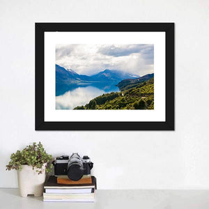 This photorealistic landscape shows a New Zealand mountain and lake set against a forest, with sunlight filtering through clouds across the scene. The blue, green, grey and white palette creates a serene, majestic, and tranquil atmosphere. The composition follows the rule of thirds and works well in modern rooms and living spaces seeking calm, nature-focused wall art.