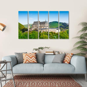 This canvas art features a majestic stone castle on a hilltop, surrounded by lush green trees under a serene blue sky. The realistic depiction captures the beauty of nature, making it a perfect addition to any landscape artwork collection.