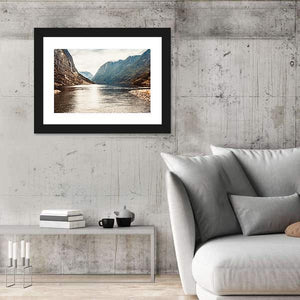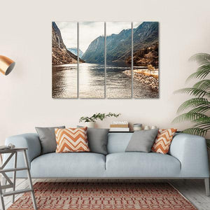 Capture the serene beauty of Norway with this stunning canvas wall art featuring tranquil fjords and majestic mountains. The realistic depiction of reflections on water and a rocky shoreline creates a peaceful atmosphere, ideal for enhancing your space.