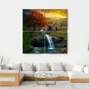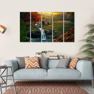 This landscape artwork captures a serene scene featuring mountains, a stone cottage, and a flowing stream. The vibrant palette of oranges, greens, and blues evokes a peaceful, rustic atmosphere, making it an ideal addition to nature-inspired decor.