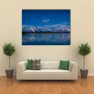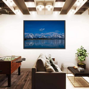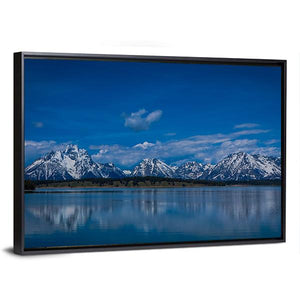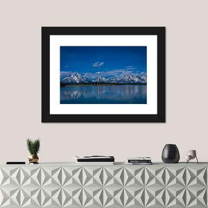 Mountains Near Jackson Lake depicts snow-capped mountains, a calm lake with reflections, and a blue sky with clouds. The realistic landscape has a serene, majestic mood and a tranquil daytime light, suited to modern or nature-inspired living rooms, bedrooms, or offices.