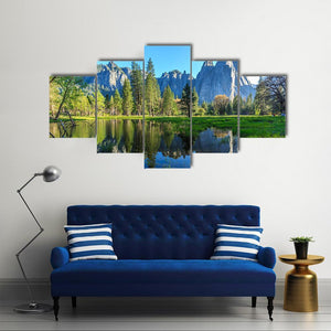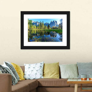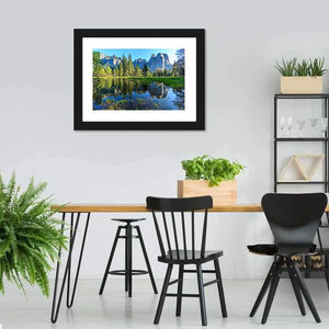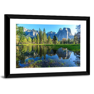 This landscape artwork captures the serene beauty of Yosemite, featuring majestic mountains, lush trees, and a tranquil lake reflecting the blue and green hues of nature. It's a perfect addition to any room that needs a touch of peace.