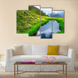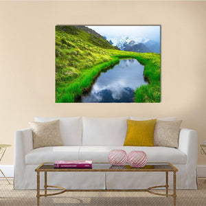 Mt Cook Reflection On Pond depicts a mountain lake with a grassy hillside and snow‑capped peaks mirrored in calm water, using green, blue, white and gray tones for a serene, majestic atmosphere. The natural landscape and rule-of-thirds composition suit modern home decor.