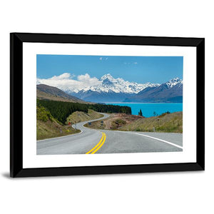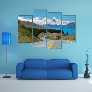 This canvas print shows Mt Cook in New Zealand — snow-capped peaks rising above a turquoise lake, a winding road with yellow lines, and a band of coniferous forest. The photorealistic scene in blue and green tones creates a peaceful, awe-inspiring mood that suits modern or nature-inspired rooms.