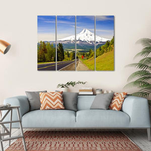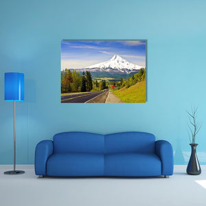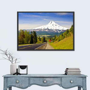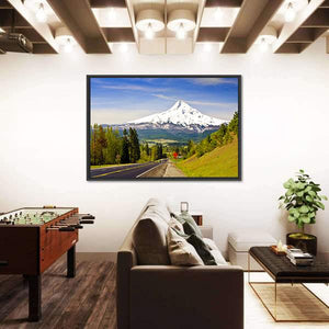 Experience the serene beauty of Mt. Hood with this stunning canvas art featuring a picturesque road flanked by lush green trees and a majestic snow-capped mountain. The vibrant colors of blue skies and white clouds create a peaceful atmosphere, making it a perfect addition to any nature-inspired decor.