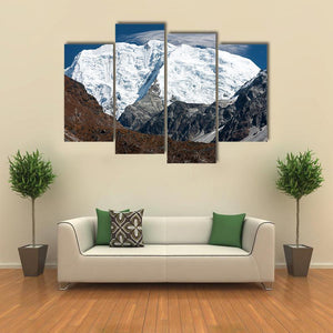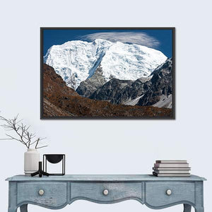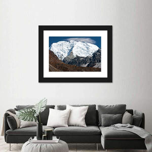 Mt Shishapangma reads as a close-up mountain study here, with snow, a steep ice face, rocky foreground and wispy clouds around the peak. The photorealistic print highlights detailed texture in a cool white, gray, brown and blue palette for a majestic, serene mood that suits modern or nature-inspired rooms.