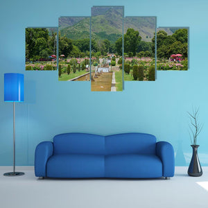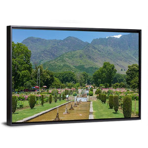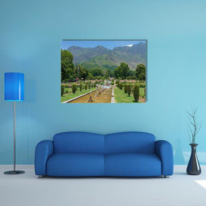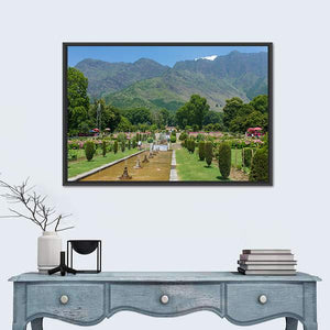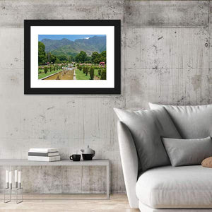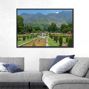 Mughal Garden in Srinagar presents a symmetrical, geometric garden centered on a fountain, flanked by rows of manicured trees with snow-capped mountains in the distance. The realistic palette of greens, blues, whites and browns creates a serene, picturesque mood that suits modern or nature-inspired rooms.