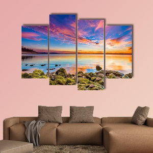 Benbrook Lake Canvas Wall Art shows a sunset over water with moss-covered rocks in the foreground and calm water reflecting pink and orange clouds. The realistic, rule-of-thirds composition creates a serene yet vibrant and slightly dramatic mood, well suited to modern living rooms or bedrooms.
