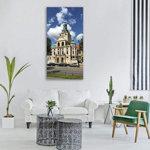 This canvas captures a museum building in Munich beneath blue summer skies, centered at eye level with ornate domes, a tall tower and fluffy clouds. The clear, bright palette of blue, white, beige, green and gray gives the scene a historic, airy feel that works well as tasteful room decor.