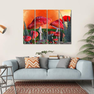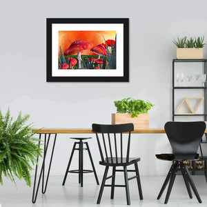 Explore a whimsical scene filled with vibrant red mushrooms, dark green foliage, and a striking orange and yellow sky. This enchanting artwork adds a touch of fantasy to any space, inviting imagination and creativity.