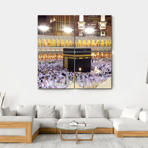Experience the deep spirituality of the Kaaba at night with this captivating canvas wall art. The bustling scene features crowds of people in white clothing gathered around the revered structure, beautifully highlighted by the gold trim and illuminated minarets. This artwork brings a profound sense of reverence to any space.