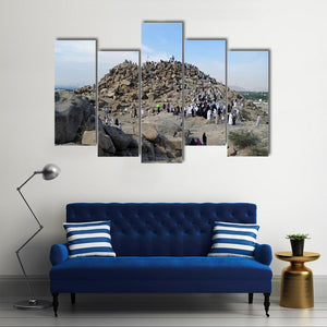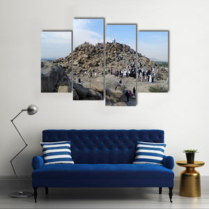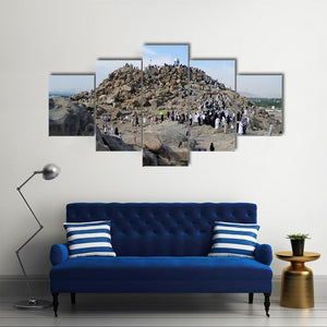 This photorealistic canvas illustrates a crowded scene at Mount Arafat, capturing people gathered on a rocky hill under a clear blue sky. The work evokes a sunny, spiritual atmosphere with its palette of browns, whites, blues, and greys.