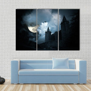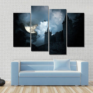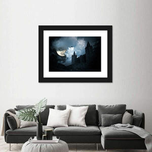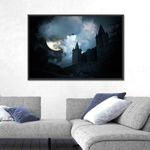This captivating canvas showcases a stone castle framed by stormy clouds and a full moon. With its dark palette of blues and grays, it creates an eerie and dramatic vibe that’s sure to intrigue viewers.