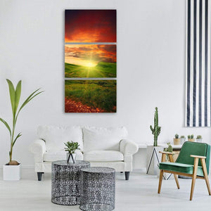 This landscape features grassy hills, a sunset sky, sunbeams breaking through clouds and a winding dirt path, creating a dramatic yet serene scene. The rule-of-thirds composition and warm reds, oranges, greens and browns lend a vibrant, natural atmosphere. Suits modern or nature-inspired rooms.