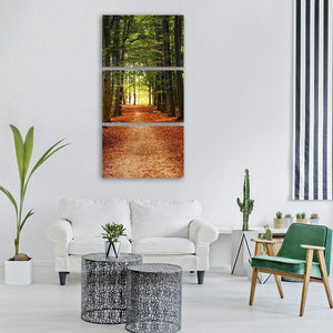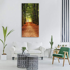 A photorealistic canvas of a forest path framed by fall foliage, with sunlight filtering through the trees and a path covered in fallen leaves. The scene feels serene and inviting and suits modern or nature-inspired interiors as a calm, nature-focused wall accent.