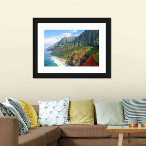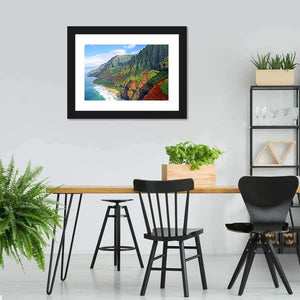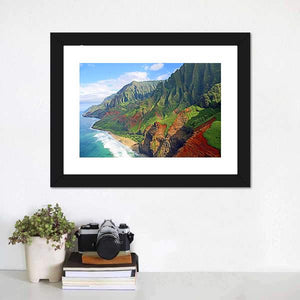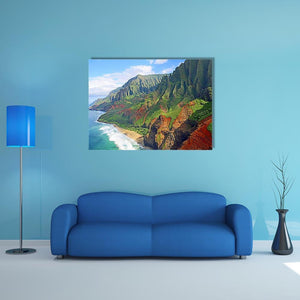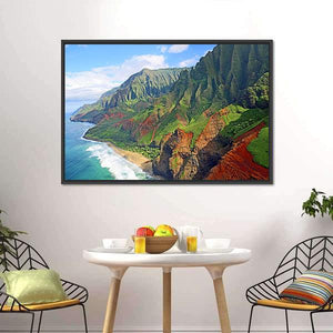 This canvas art beautifully captures the majestic coastal cliffs and serene ocean waves of Na Pali Coast, Hawaii. With a palette of lush greens and earthy tones, it brings natural beauty into your space, perfect for any modern decor.