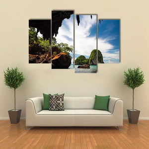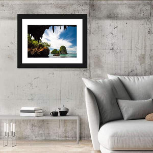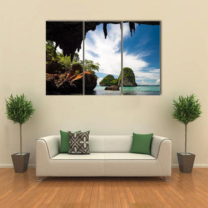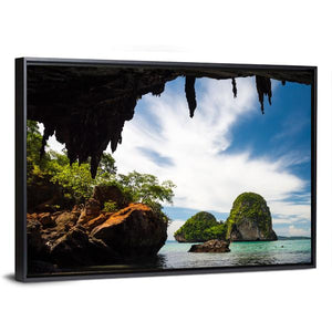 Phra Nang Cave Beach Canvas Wall Art shows the view from inside a cave looking out to clear turquoise water, rock formations and distant islands beneath a bright blue sky. The photorealistic scene feels serene and tropical, with stalactites and lush green vegetation framing the opening. It suits modern homes and beach-inspired rooms as calm, nature-focused wall decor.