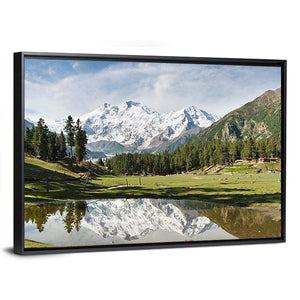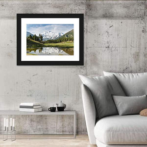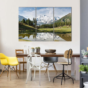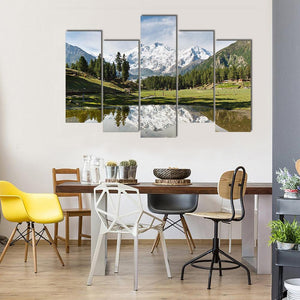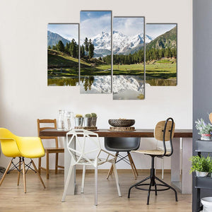 This canvas art captures the majestic beauty of snow-capped mountains reflecting in a serene pond, surrounded by lush forests and rolling hills. The calming blue and green palette, combined with realistic details, makes it a fitting addition to any room in need of tranquility.