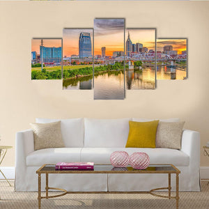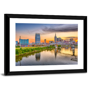 Nashville Downtown Skyline Canvas shows the city skyline at sunset, with tall buildings reflected in the river beneath a dramatic, cloud-streaked sky. The photorealistic print highlights a blue, orange, green and grey palette with a treelined riverbank and bridge, creating a vibrant, serene, reflective mood that suits modern living rooms and offices.