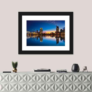 This canvas beautifully captures the Nashville skyline at night, showcasing striking skyscrapers reflecting on the calm waterfront. The serene and vibrant colors of blue, yellow, and orange evoke a peaceful urban atmosphere, making it a fitting addition to your home decor.