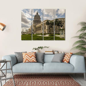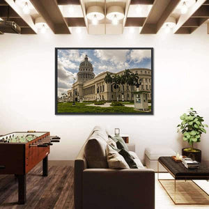 This canvas artwork features the grand National Capitol building in Havana, showcasing its neoclassical architecture surrounded by palm trees and a vibrant lawn. The sunny mood and realistic depiction evoke a sense of tropical elegance, making it an eye-catching addition to any wall.