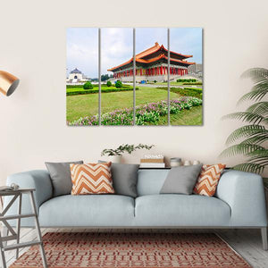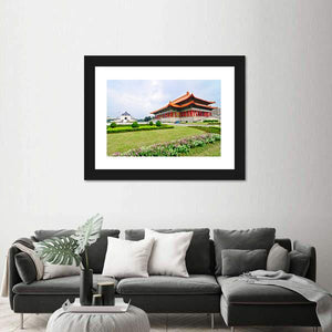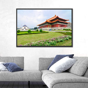 This canvas art showcases the National Theater Hall of Taiwan, featuring its red columns and orange roof against a backdrop of serene gardens. The vibrant scene, framed by rows of colorful flowers, evokes a peaceful and grand atmosphere, perfect for enhancing your living space.