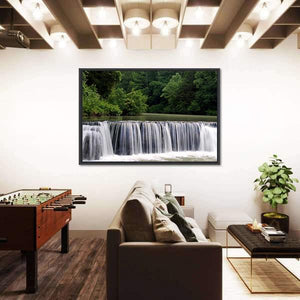 A panoramic nature photograph of a curtain-like waterfall flowing into a river, set among trees in a palette of greens, whites, blues, and browns. The scene reads as serene and calm, a natural focal point for nature-inspired rooms and quiet interiors.