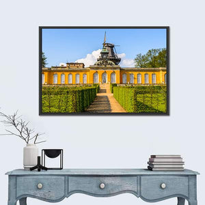 This photorealistic canvas captures Potsdam’s classical architecture alongside a manicured garden and a nearby windmill. The symmetrical scene uses warm yellow and green tones with clear blue sky to create a serene, sunny, and majestic atmosphere. It works well as wall decor for homes and modern interiors.