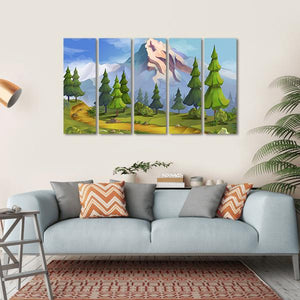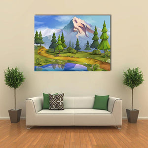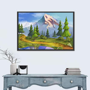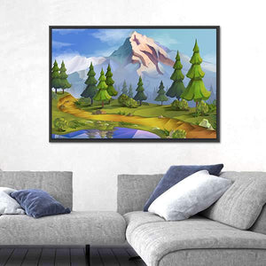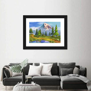 This vibrant landscape illustration captures a serene scene with stylized pine trees, a winding yellow path, and a tranquil lake reflecting the blue sky. Its peaceful atmosphere makes it a delightful addition to any space.