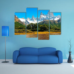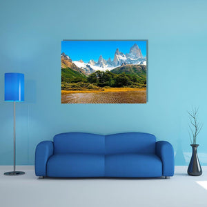 This canvas artwork captures a serene landscape featuring snow-capped mountains and a tranquil lake surrounded by lush greenery. The photorealistic style invites a sense of calm and appreciation for nature's beauty.